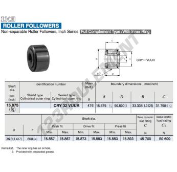 Le Galet De Roulement, connu sous la référence CRY32-VUUR-IKO, de la marque IKO, possède un diamètre intérieur de 15.875mm, un diamètre extérieur de 50.8mm et une épaisseur de 33.338mm.