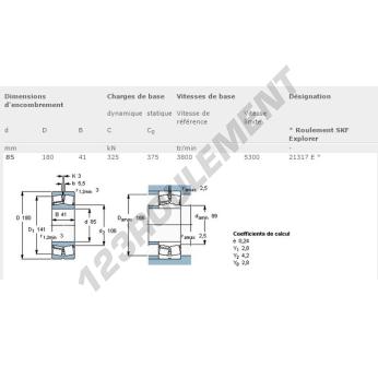 Le Roulement à Rotule Sur Rouleaux, connu sous la référence 21317-E-SKF, de la marque SKF, possède un diamètre intérieur de 85 mm, un diamètre extérieur de 180 mm et une épaisseur de 41 mm.
