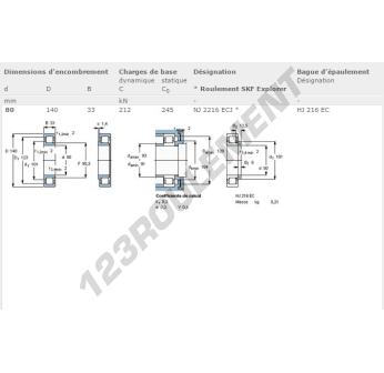 Le Roulement à Rouleaux, connu sous la référence NJ2216-ECJ-SKF, de la marque SKF, possède un diamètre intérieur de 80 mm, un diamètre extérieur de 140 mm et une épaisseur de 33 mm.