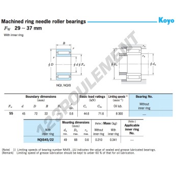 Le Roulement à Rouleaux, connu sous la référence NQIS45-22-JTEKT, de la marque JTEKT, possède un diamètre intérieur de 45 mm, un diamètre extérieur de 72 mm et une épaisseur de 22 mm.