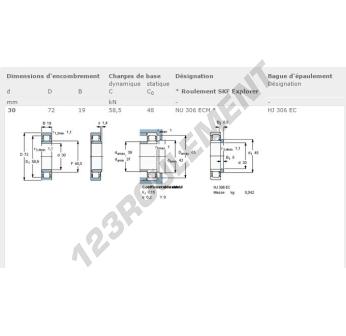 Le Roulement à Rouleaux, connu sous la référence NU306-ECM-SKF, de la marque SKF, possède un diamètre intérieur de 30 mm, un diamètre extérieur de 72 mm et une épaisseur de 19 mm.