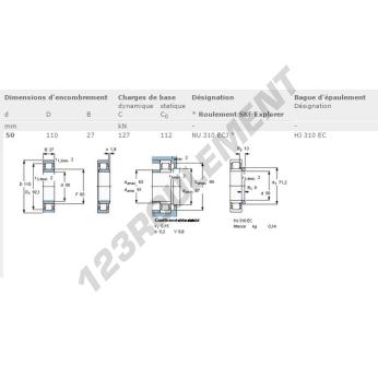 Le Roulement à Rouleaux, connu sous la référence NU310-ECJ-SKF, de la marque SKF, possède un diamètre intérieur de 50 mm, un diamètre extérieur de 110 mm et une épaisseur de 27 mm.