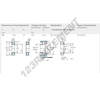 Le Roulement à Rouleaux, connu sous la référence NU310-ECM-SKF, de la marque SKF, possède un diamètre intérieur de 50 mm, un diamètre extérieur de 110 mm et une épaisseur de 27 mm.
