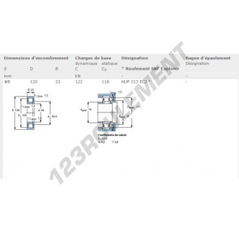 Le Roulement à Rouleaux, connu sous la référence NUP213-ECJ-SKF, de la marque SKF, possède un diamètre intérieur de 65 mm, un diamètre extérieur de 120 mm et une épaisseur de 23 mm.